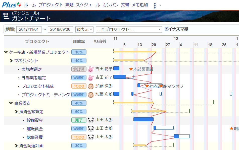 Plusプロジェクトマネージャーでは、プロジェクトや課題の期間、進捗率、担当者といった基本的な管理項目は当然のこと、マイルストン、TODO、実施日、完了基準など、プロジェクト管理に欠かせない項目を標準提供しています。